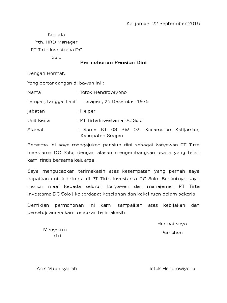 Contoh surat pensiun dini yang di publikasikan pada tanggal 20190427 pukul 071935am merupakan salah satu bagian dari artikel cara membuat surat. Get, create, make and sign permohonan pensiun dini. Pengajuan atau permohonan bisa dibuat oleh bawahan kepada pimpinan, ataupun antar instansi dan kantor. Contoh surat pengunduran diri kepada supervisor/kepala bagian. Hrd manager pt tirta ine!tama d s#l# permohonan <b>pensiun dini.